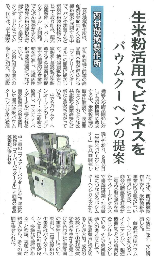 中でもバウムクーヘンオーブンのトップメーカー・不二商会と協業し、フェアリーパウダーミルで得られる自家製粉生米粉を活用した地元産米バウムクーヘンビジネスを推奨しており、9月13日「米粉×バウムウエビナー」を共同開催した。まず、西村機械製作所から、米粉製粉や事業の取り組みについて説明したのち、不二商会の藤波哲也社長が「湿式米粉の強みを生かすスイーツビジネスで事業再構築・社会貢献につながるバウムクーヘンビジネスからの検証」をテーマに講演した。