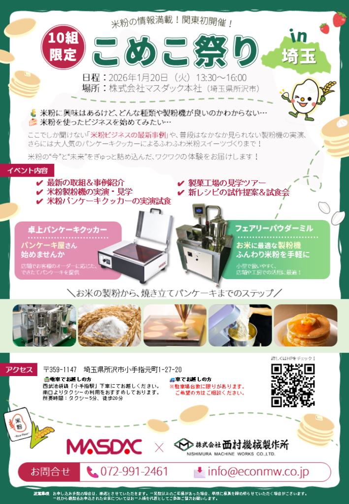 ここでしか聞けない「米粉ビジネスの最新事例」や、普段はなかなか見られない製粉機の実演、さらには大人気のパンケーキクッカーによるふわふわ米粉スイーツづくりまで!