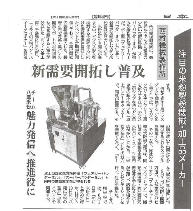 西村機械製作所は、微粉砕かつでんぷん損傷の少ない気流粉砕機「スーパーパウダーミル」が強みの米粉製粉機メーカーだ。卓上型「フェアリーパウダーミル」と併せて、新需要を開拓しながら米粉普及に尽力している。米粉に対する関心が高まる中、ビジネス参入を検討する企業や個人に向けた情報提供を目的にしたイベントを定期的に開催しており、今期は同社の製粉機を導入した、長野市内で製菓・製パンの開業サポートと材料提供などを展開する丸富士が設立した「ミライの米工房」を会場に11月26日、「ミライの米粉パン・スイーツセミナー」を開催する。
