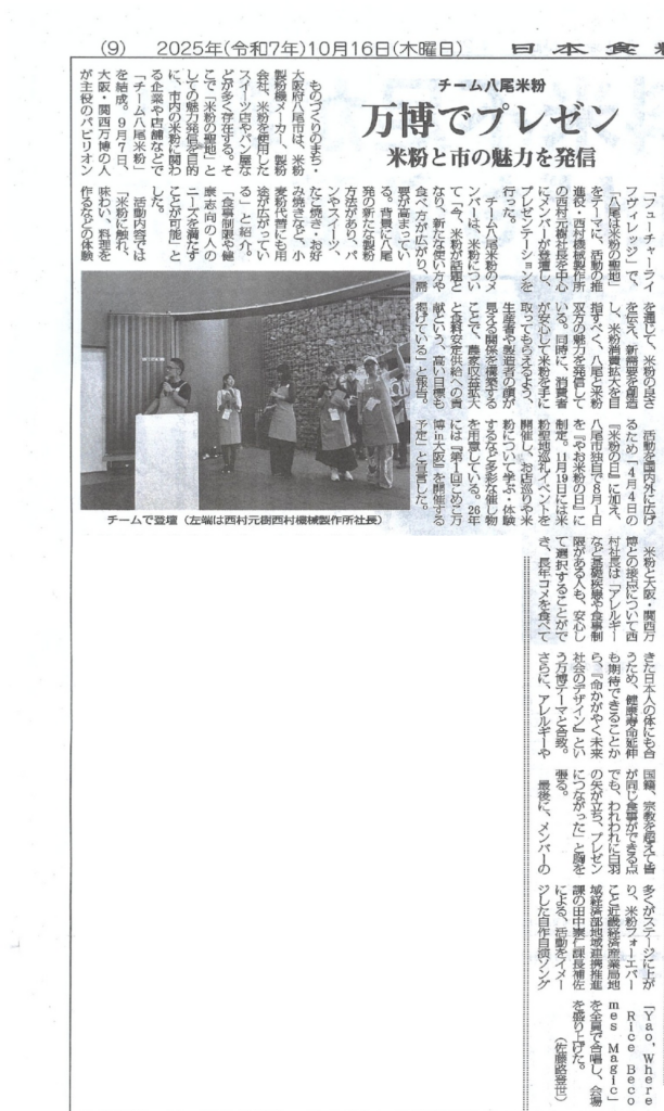 ものづくりのまち・大阪府八尾市は、米粉製粉機メーカー、製粉会社、米粉を使用したスイーツ店やパン屋などが多く存在する。そこで「米粉の聖地」としての魅力発信を目的に、市内の米粉に関わる企業や店舗などで「チーム八尾米粉」を結成。9月7日、大阪・関西万博の人が主役のパビリオン「フューチャーライフヴィレッジ」で、「八尾は米粉の聖地」をテーマに、活動の推進役・西村機械製作所の西村元樹社長を中心にメンバーが登壇し、プレゼンテーションを行った。チーム八尾米粉のメンバーは、米粉について「今、米粉が話題となり、新たな使い方や食べ方が広がり、需要が高まっている。背景に八尾発の新たな製粉方法があり、パンやスイーツ、たこ焼き・お好み焼きなど、小麦粉代替にも用途が広がっている」と紹介。「食事制限や健康志向の人のニーズを満たすことが可能」とした。