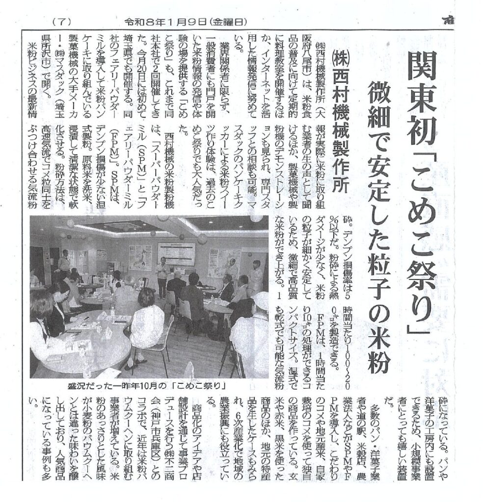 業界関係者に限らず、一般消費者にも門戸を開いた米粉情報の発信や体 験の場を提供する「こめこ祭り」も、これまで同社本社で2回開催してき た。今月20日には初めて埼玉県でも開催する。同社のフェアリーパウダー ミルを導入して米粉パンケーキに取り組んでいる製菓機械の大手メーカ ー・(株)マスダック(埼玉県所沢市)で開く。